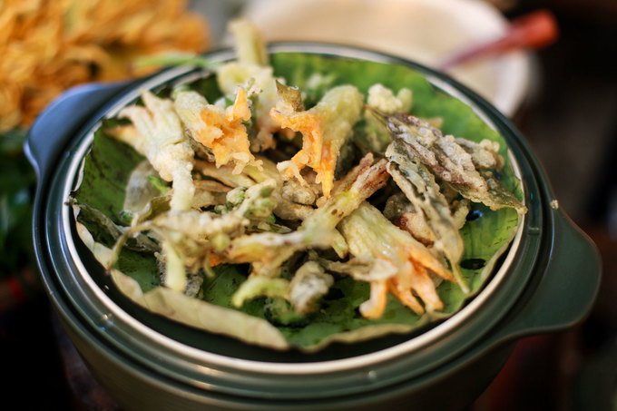 Món hoa bốn mùa chiên giòn do cô Võ Thị Thu Hà, thành viên Trung tâm Nghiên cứu, Bảo tồn và Phát triển Ẩm thực Việt Nam, thực hiện. Nguyên liệu chính là bông thiên lý, hoa bí, đọt trà xanh… có thể ăn kèm sốt hoặc mứt mơ và gia vị. Thông thường những nguyên liệu này thường được luộc hoặc xào.
